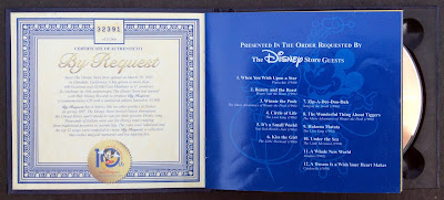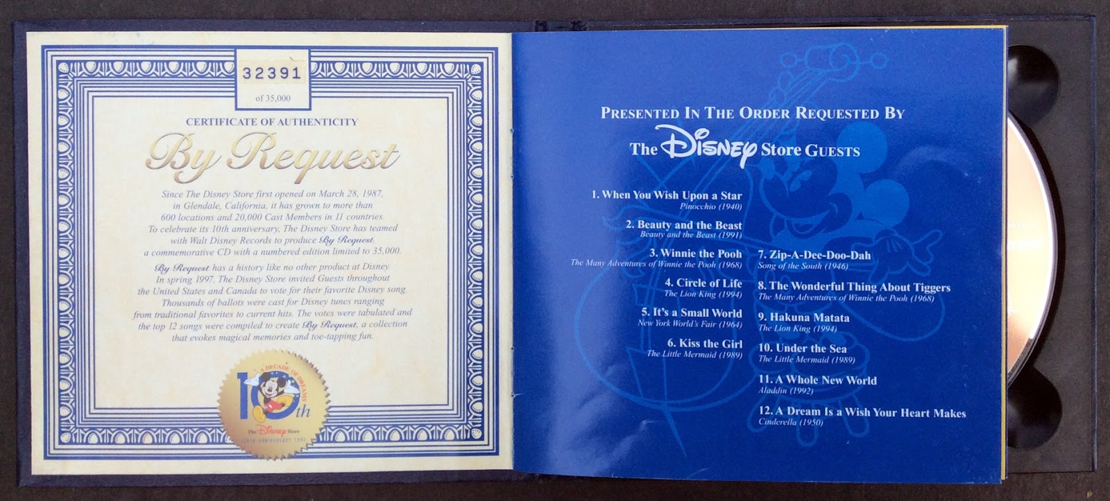 Here's something I found in a thrift shop recently. Its a CD of Disney music to celebrate the 10th anniversary of the Disney Store. Here is what is says inside the CD: Since The Disney Store first opened on March 28th, 1987, in Glendale, California, it has grown to more than 600 locations and 20,000 Cast Members in 11 countries. To celebrate its 10th anniversary, The Disney Store has teamed with Walt Disney Records to produce By Request, a commemorative CD with a numbered edition limited to 35,000. By Request has a history like no other product at Disney. In spring 1997, The Disney Store invited Guests throughout the United States and Canada to vote for their favorite Disney song. Thousands of ballots were cast for Disney tunes ranging from traditional favorites to current hits. The votes were tabulated and the top 12 songs were compiled to create By Request, a collection that evokes magical memories and toe-tapping fun. This copy is number 32391 of 35,000.